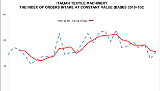 New orders for Italian textile machinery were negative both in foreign markets and Italy. Overseas orders decreased by 8%, with an absolute index value of 98.9 points. The drop in domestic orders was even more pronounced, at minus 22%. The absolute value of the index was 94.9 points.